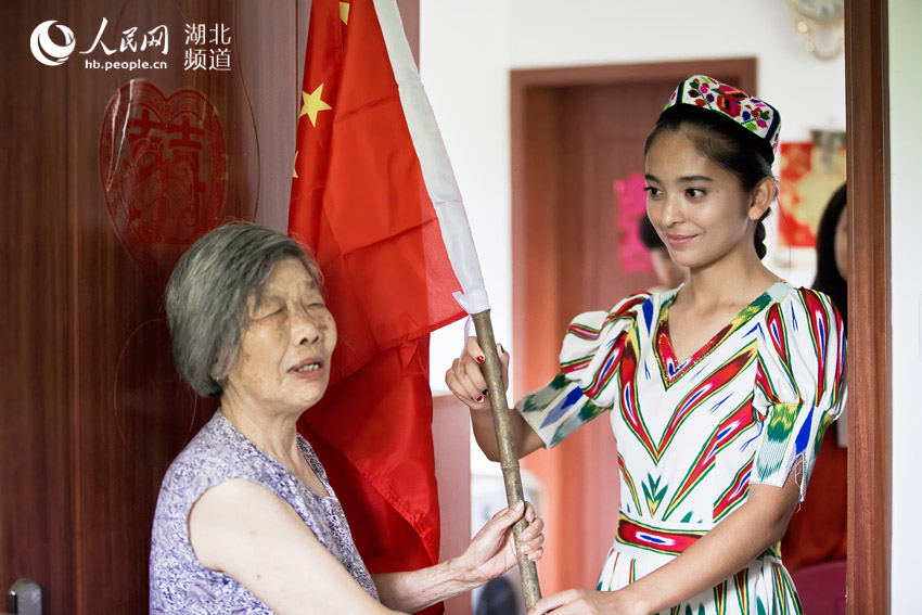 beat365中文官方网站民族教育学院维吾尔族学生阿丽米热,热情地敲开了80岁婆婆张华荣的大门,将红旗送到她的手中。