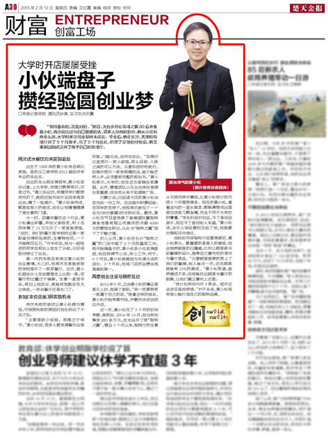 创业的念头萌生得很早,黄小松告诉记者,上大学前,他做过教育培训,还卖过书。“高三毕业时,我看同学们都想把书扔了,就把这些书低价买回来再卖出去,赚了一些差价。”黄小松举例说,都是些很小的尝试,但也让他慢慢摸清了做生意的门道。