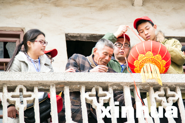 图为同学们为村民挂上喜庆的红灯笼(摄影:李鳌)