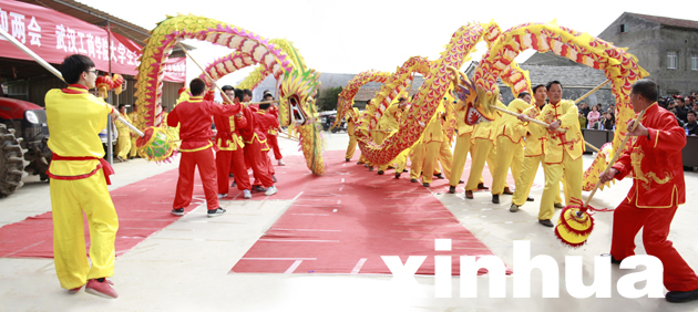 图为村民和大学生表演的“双龙戏珠”(摄影杨行、林倩)