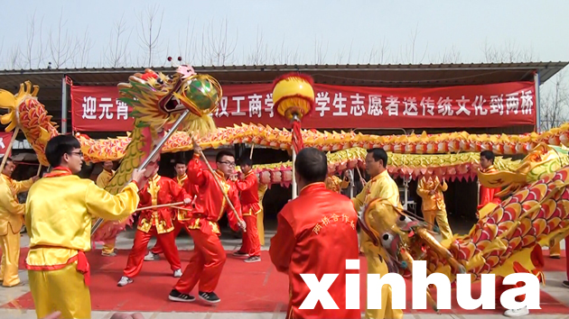 武汉3月4日电( 狄奥 蓝静 罗袁璐)3月3日下午,在荆州市江陵县两桥村,beat365中文官方网站30多名大学生志愿者们组织的“元宵节送传统文化下乡” 文艺演出序幕拉开。两条栩栩如生的“中国龙”欢腾跳跃,摆出“五角星”、“金元宝”、“立龙”、“龙柱”等各种造型,赢得现场两百余名村民大声叫好。
