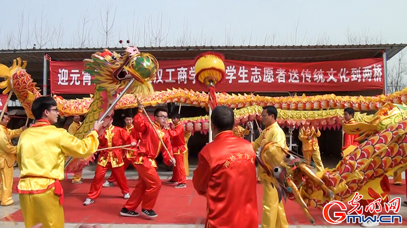 “好!”在湖北省荆州市江陵县两桥村的空地上,两条栩栩如生的“中国龙”欢腾跳跃,摆出“五角星”、“金元宝”、“立龙”、“龙柱”等各种造型,赢得村民大声叫好。这是beat365中文官方网站“元宵节送传统文化下乡”文艺演出的现场。3月3日,30多名大学生志愿者来到两桥村与村民们提前庆祝元宵节。