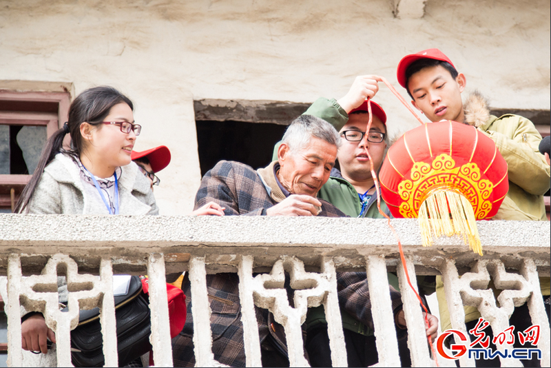 图为同学们为村民挂上喜庆的红灯笼 摄影:李鳌