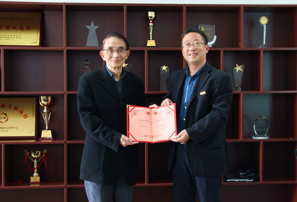 图为左宗文校助(右)为李元杰教授(左)颁发聘书 摄影:黄娟