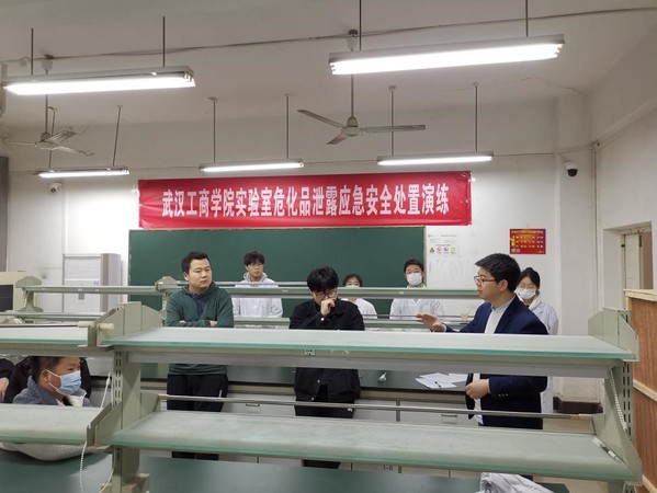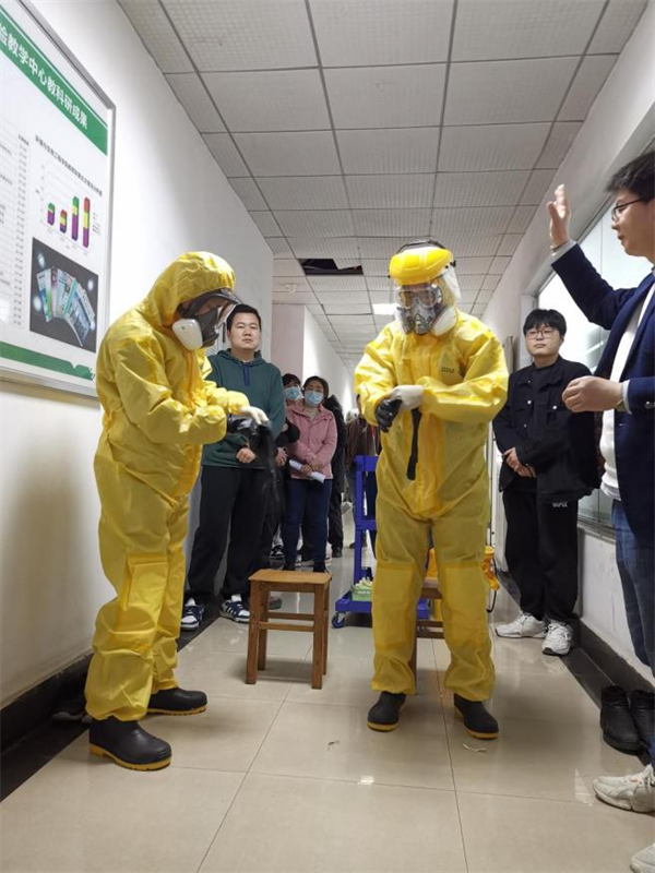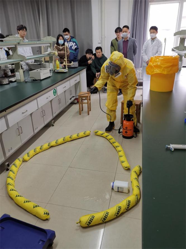 下午,为提高培训演练效果,让在场每位师生听得懂、看得清、学得会和有参与感,演练过程中,屈文军老师特地让学生来扮演实验室的相关人员,一边讲解一边示范,将危险化学品泄漏后实验人员个人救护、紧急动员、事故处置等应急处置规范化流程完整呈现。环境与生物工程学院龚乃超老师、徐文广老师则在演练中扮演应急处置小组成员,在现场详细展示实验室安全防护设施的正确使用方法,讲解应对危险化学品泄露的正确处置流程。