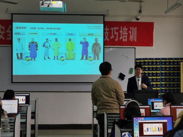 此次培训活动由实验教学中心主办,环境与生物工程学院承办,特邀具有实验室化学品市场和研发工作11年工作经验的实验室安全培训资深讲师屈文军来校主讲,培训演练共设置了“实验室安全事故应急处置流程与技巧”“实验室化学品泄漏事故应急演练”和“应急冲淋和洗眼装置使用演练”三个主题。
