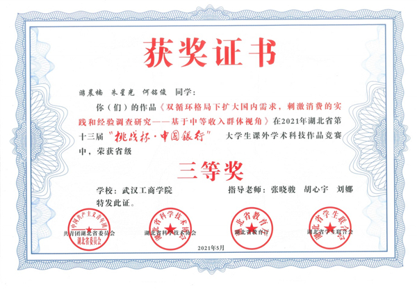 游晨楠的成功不是偶然,大学四年他一直都在为自己的目标努力着。在校期间,游晨楠一直保持年级第一的好成绩,获得过两次国家奖学金、三次校级奖学金,以及校三好学生、优秀学生干部等荣誉称号。他还在专业老师的指导下参加了各类学科竞赛,荣获第十三届全国大学生数学竞赛三等奖、第二届全国高等院校数学能力挑战赛优秀奖、第十届湖北省数学竞赛二等奖、第十五届“挑战杯”中国银行全国大学生课外学术科技作品竞赛省级三等奖等奖项。