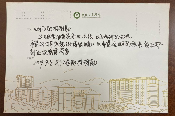 在2019年的学校迎新现场,作为大一新生的桂羽勤在时光明信片上坚定写下了未来大学生涯的目标。入校后,她就制定了考研学习规划,夯实专业基础,加强实践能力,提升英语成绩。