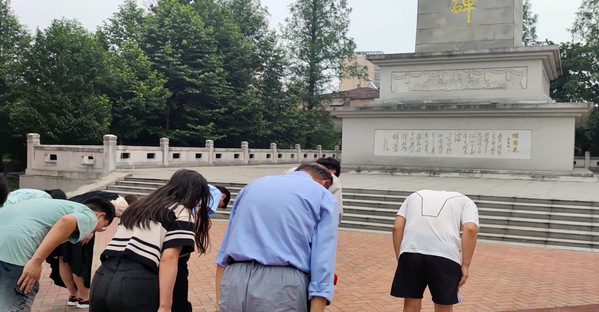 图为实践团队成员向张自忠将军纪念碑鞠躬 摄影:陈宝兴