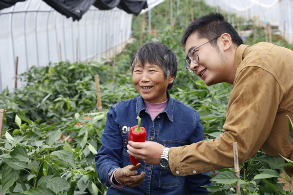 图为宗国凯老师和村民沟通农产品的特性 摄影:周逸文