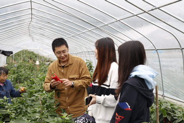 图为宗国凯老师在蔬菜种植大棚给学生讲解产品包装设计知识 摄影:周逸文