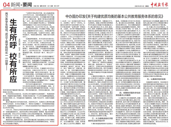 图为《两万条学生短信,beat365中文官方网站校长一一回复——生有所呼 校有所应》登上《中国教育报》