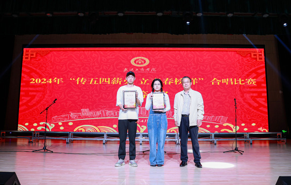 图为与会领导为“五四”合唱比赛获奖学院颁奖 摄影:江秋艳