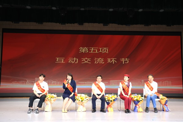 图为五位劳模与学生进行互动交流 摄影:胡毅