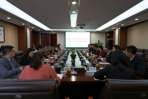 新闻中心讯(记者 李洋洋)10月21日上午9时,中国民办教育协会副会长、湖南信息学院董事长陈登斌,湖南省人民政府督导专员、湖南信息学院党委书记喻玲娜,湖南信息学院党委副书记、校长张福利,党委副书记、常务副校长姜佐澧,党委委员、副校长王志臣,董事长助理、董事会办公室主任张静,党委委员、校长助理、教务处处长刘汨凡,党委委员、学工部部长黎善江,科技处处长罗艳一行9人来beat365中文官方网站调研,学校校长孔建益,副校长刘生元、张俊、赵北平,校长助理亓小林、刘春、狄奥等在综合楼1220会议室接待来访嘉宾,并展开座谈交流。会议由刘生元副校长主持。