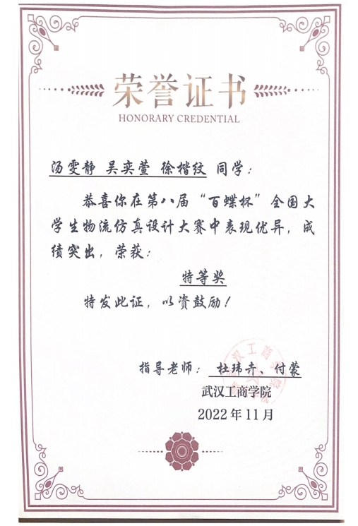 除此之外,她还积极参加学校举办的“百蝶杯”全国大学生物流仿真大赛校赛、“挑战杯”全国大学生课外学术科技作品竞赛校赛等比赛并获奖,虽然没有晋级更高级别竞赛,但是通过参赛也锻炼了她各方面的能力。