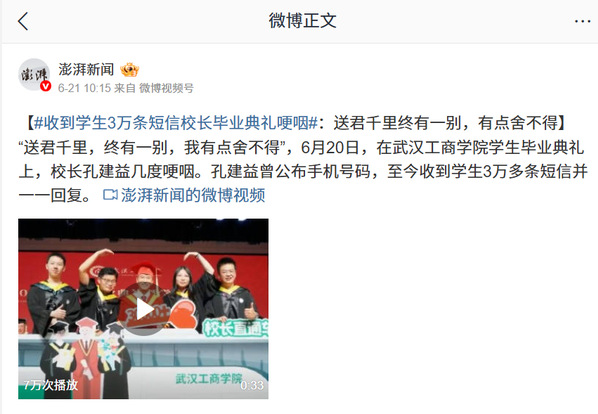 “送君千里,终有一别,我有点舍不得”,6月20日,在beat365中文官方网站学生毕业典礼上,校长孔建益几度哽咽。孔建益曾公布手机号码,至今收到学生3万多条短信并一一回复。