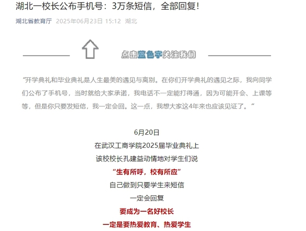 “开学典礼和毕业典礼是人生最美的遇见与离别。在你们开学典礼的遇见之际,我向同学们公布了手机号,当时就给大家承诺,我电话不一定能打得通,因为可能开会、上课等等,但是你只要发短信,我一定会回。这一点,我想大家这4年来也应该见证了。”