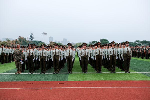 拳术方队的表演点燃全场激情。队员们目光如炬,神采奕奕。冲拳、弹腿、格挡,动作刚劲有力,整齐划一;转身、腾挪、收势,姿态利落干脆,充满力量,充分展现了新生们经过军训锻炼后坚韧不拔的意志和过硬的军事素养。