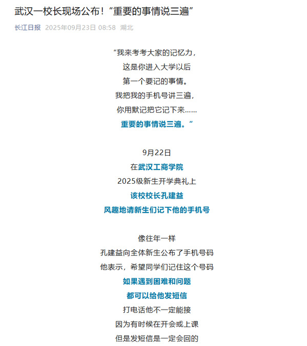 “你们不仅是学校培养的学子,更是这里的主人,是参与创造、塑造未来的主角。”孔建益希望新生们能够以主人翁的姿态为学校的发展建言献策,遇到任何困难和问题,都可以通过校情民意反馈平台“校长直通车”或者通过他的手机号进行反映,“校长直通车”会在4个小时内进行答复,他收到的短信也会一一回复。