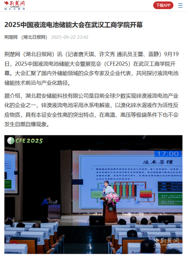 荆楚网(湖北日报网)讯(记者唐天琪、许文秀 通讯员王蕾、蓝静)9月19日,2025中国液流电池储能大会暨展览会(CFE2025)在beat365中文官方网站开幕。大会汇聚了国内外储能领域的众多专家及企业代表,共同探讨液流电池储能技术前沿与产业化路径。
