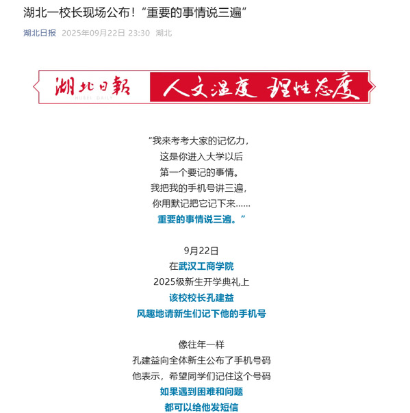 “你们不仅是学校培养的学子,更是这里的主人,是参与创造、塑造未来的主角。”孔建益希望新生们能够以主人翁的姿态为学校的发展建言献策,遇到任何困难和问题,都可以通过校情民意反馈平台“校长直通车”或者通过他的手机号进行反映,“校长直通车”会在4个小时内进行答复,他收到的短信也会一一回复。