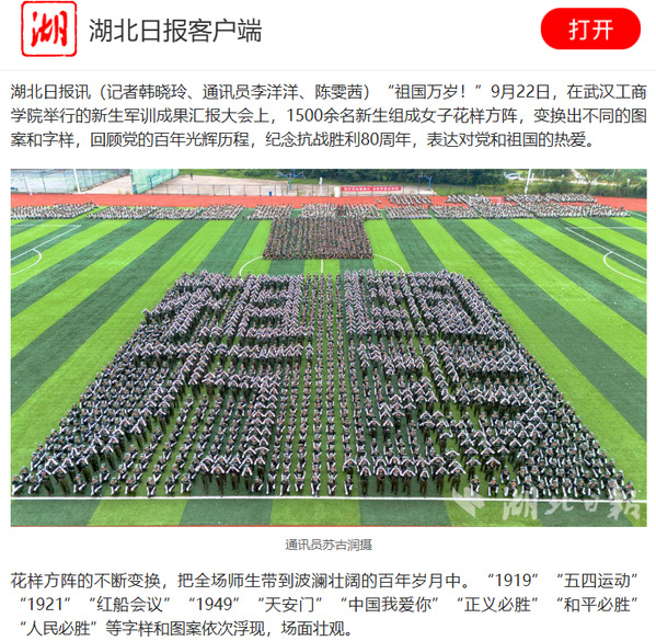 湖北日报讯(记者韩晓玲、通讯员李洋洋、陈雯茜)“祖国万岁!”9月22日,在beat365中文官方网站举行的新生军训成果汇报大会上,1500余名新生组成女子花样方阵,变换出不同的图案和字样,回顾党的百年光辉历程,纪念抗战胜利80周年,表达对党和祖国的热爱。