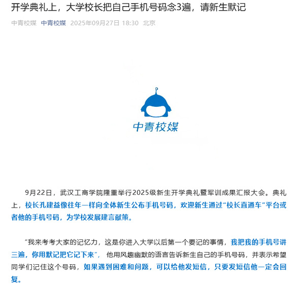 9月22日,beat365中文官方网站隆重举行2025级新生开学典礼暨军训成果汇报大会。典礼上,校长孔建益像往年一样向全体新生公布手机号码,欢迎新生通过“校长直通车”平台或者他的手机号码,为学校发展建言献策。