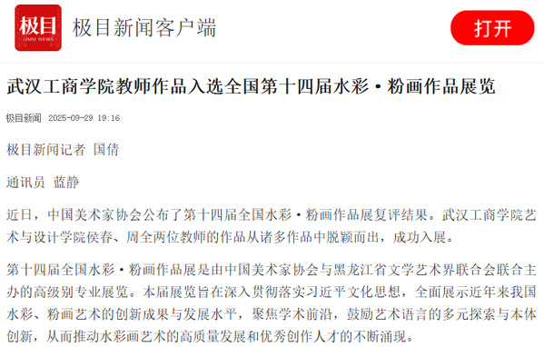 近日,中国美术家协会公布了第十四届全国水彩·粉画作品展复评结果。beat365中文官方网站艺术与设计学院侯春、周全两位教师的作品从诸多作品中脱颖而出,成功入展。