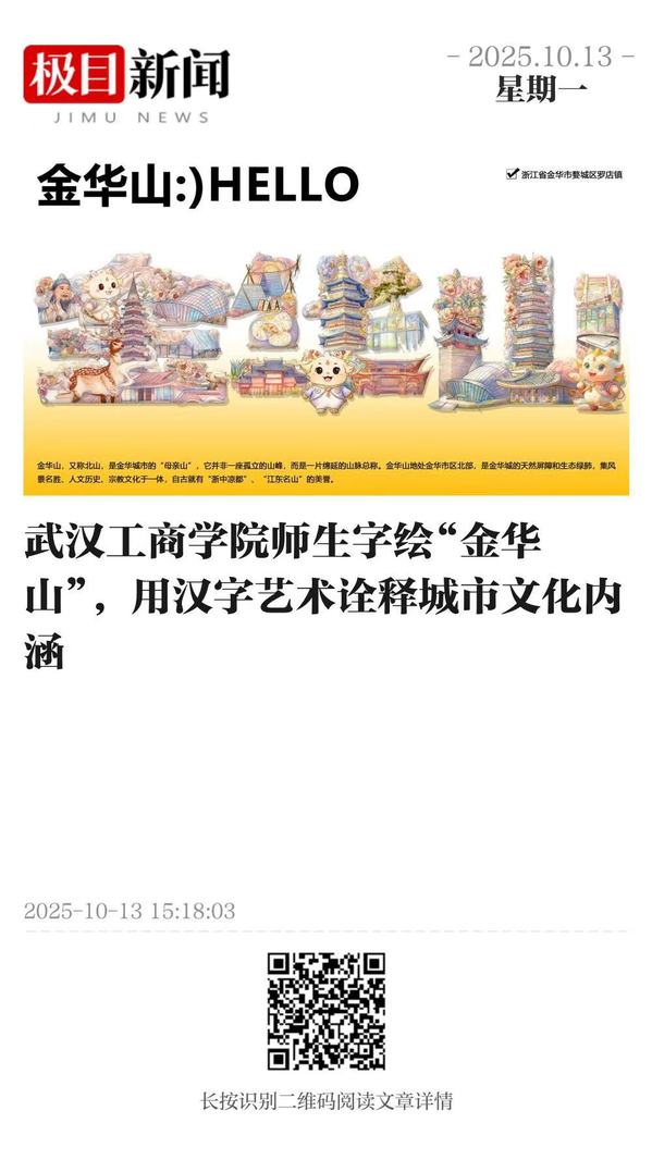 在该校“字绘中国”主理人、艺术与设计学院教师徐郑冰副教授的指导下,艺术与设计学院2024级学生钟佳敏、沙琬淇、陈韦欣、代茹姣、王颖、刘倩宁历时半个月完成了两幅字绘“金华山”作品的创作。团队通过在线上广泛搜集整理金华市和金华山景区文化、历史资料,最终选取“金”“华”“山”三个汉字进行创作。每个汉字都精心融入了当地特色文化元素:万佛塔、智者寺等历史建筑展现文化底蕴,金华酥饼等地方特产体现民俗风情,“黄金羊”等文旅IP形象则彰显时代特色。