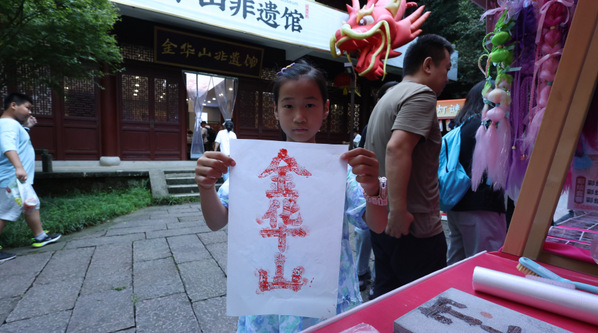 图为一名游客在景区手拿字绘“金华山”作品合影