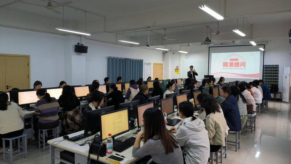 培训采用“实操主导、互动辅助”的教学模式,参训教师通过手机或电脑实时接入学习群,同步获取AI工具资源、提示词模板与操作指令。现场互动频繁,气氛活跃,在提问环节,多位教师就“AI处理复杂数据的准确性”“如何将AI融入日常办公流程”等问题踊跃发言,郑宇一一作出专业解答,现场交流深入而热烈。