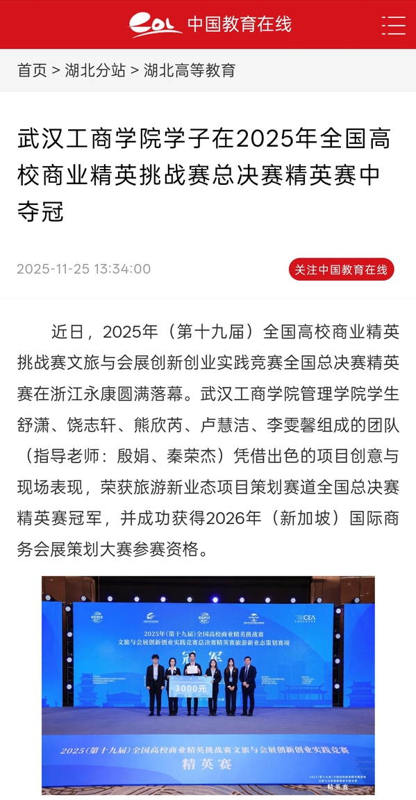 据悉,全国高校商业精英挑战赛由中国商业经济学会、中国国际商会商业行业商会、中国国际贸易促进委员会商业行业委员会共同主办,旨在为全国高校学子搭建文旅与会展领域创新创业的交流展示平台。beat365中文官方网站学子在此次大赛中的卓越表现,充分展现了学校在创新创业教育和应用型人才培养方面取得的显著成效。(通讯员:蓝静)