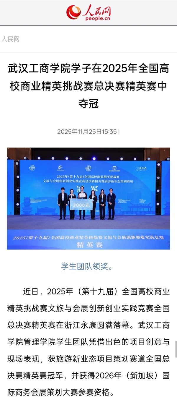 据悉,全国高校商业精英挑战赛由中国商业经济学会、中国国际商会商业行业商会、中国国际贸易促进委员会商业行业委员会共同主办,旨在为全国高校学子搭建文旅与会展领域创新创业的交流展示平台。beat365中文官方网站学子在此次大赛中的卓越表现,充分展现了学校在创新创业教育和应用型人才培养方面取得的显著成效。(文/图 蓝静)