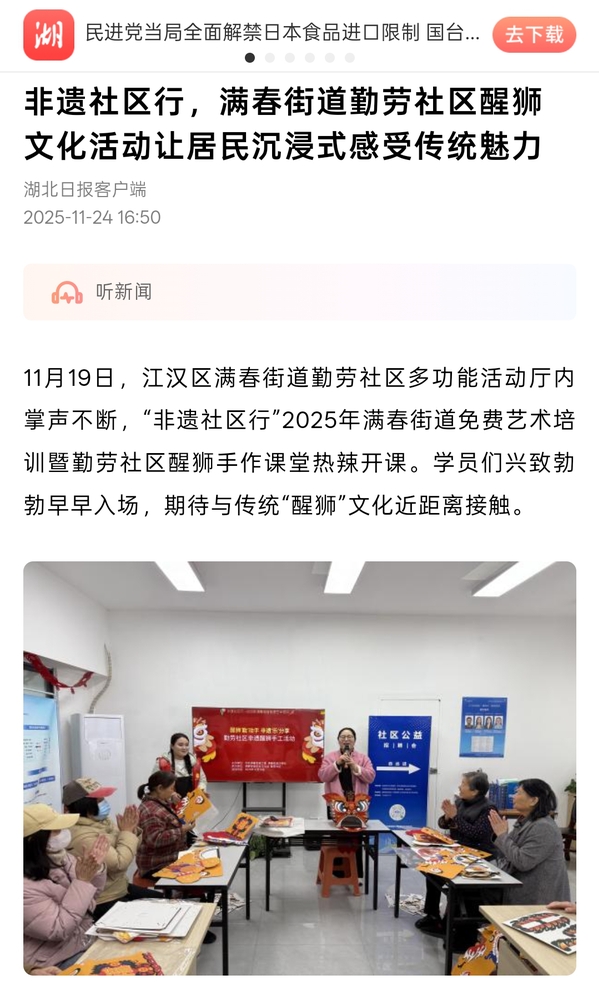 11月19日,江汉区满春街道勤劳社区多功能活动厅内掌声不断,“非遗社区行”2025年满春街道免费艺术培训暨勤劳社区醒狮手作课堂热辣开课。学员们兴致勃勃早早入场,期待与传统“醒狮”文化近距离接触。