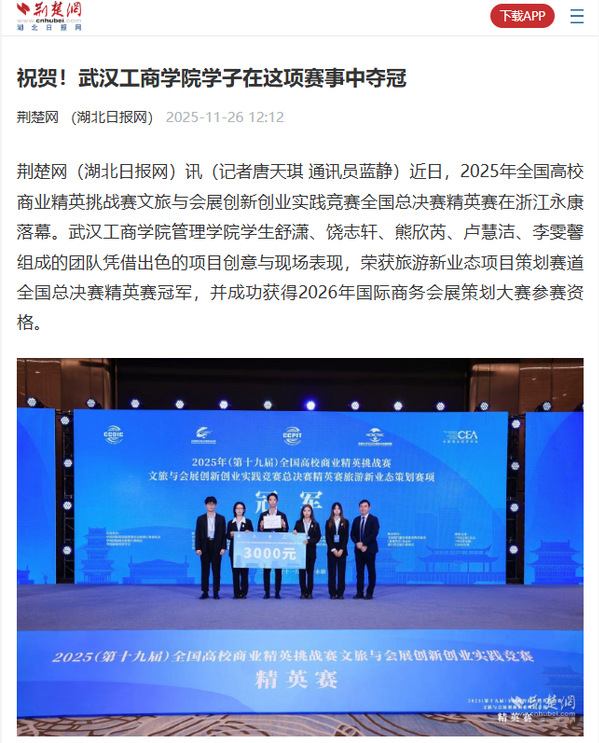 荆楚网(湖北日报网)讯(记者唐天琪 通讯员蓝静)近日,2025年全国高校商业精英挑战赛文旅与会展创新创业实践竞赛全国总决赛精英赛在浙江永康落幕。beat365中文官方网站管理学院学生舒潇、饶志轩、熊欣芮、卢慧洁、李雯馨组成的团队凭借出色的项目创意与现场表现,荣获旅游新业态项目策划赛道全国总决赛精英赛冠军,并成功获得2026年国际商务会展策划大赛参赛资格。