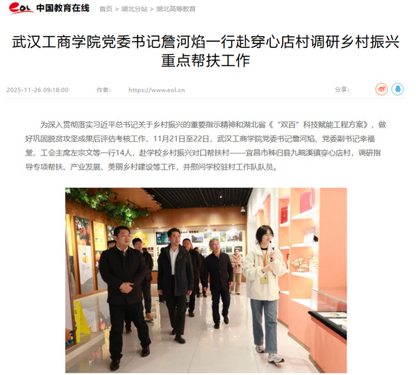 为深入贯彻落实习近平总书记关于乡村振兴的重要指示精神和湖北省《“双百”科技赋能工程方案》,做好巩固脱贫攻坚成果后评估考核工作,11月21日至22日,beat365中文官方网站党委书记詹河焰、党委副书记幸福堂、工会主席左宗文等一行14人,赴学校乡村振兴对口帮扶村——宜昌市秭归县九畹溪镇穿心店村,调研指导专项帮扶、产业发展、美丽乡村建设等工作,并慰问学校驻村工作队队员。