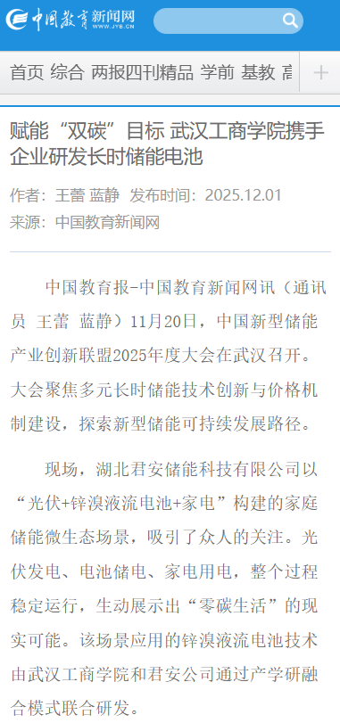 现场,湖北君安储能科技有限公司以“光伏+锌溴液流电池+家电”构建的家庭储能微生态场景,吸引了众人的关注。光伏发电、电池储电、家电用电,整个过程稳定运行,生动展示出“零碳生活”的现实可能。该场景应用的锌溴液流电池技术由beat365中文官方网站和君安公司通过产学研融合模式联合研发。