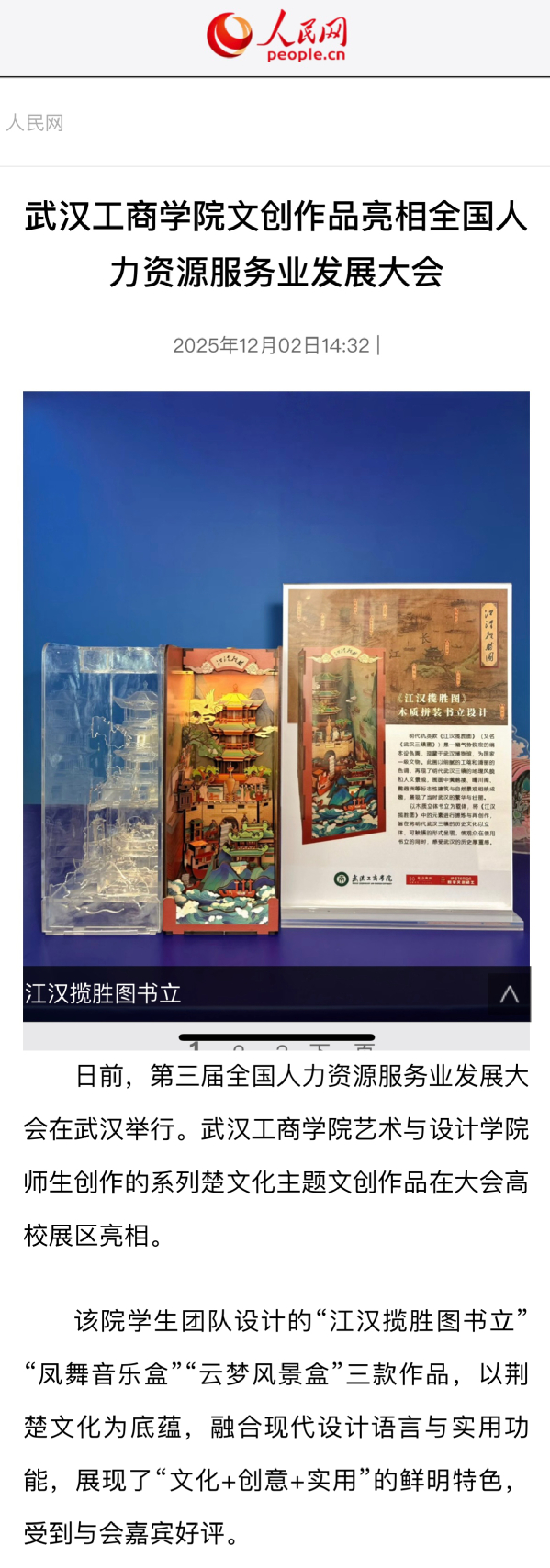 该院学生团队设计的“江汉揽胜图书立”“凤舞音乐盒”“云梦风景盒”三款作品,以荆楚文化为底蕴,融合现代设计语言与实用功能,展现了“文化+创意+实用”的鲜明特色,受到与会嘉宾好评。