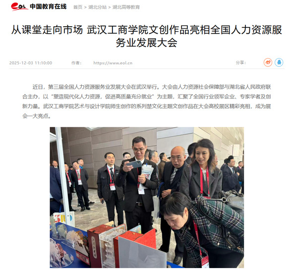 近日,第三届全国人力资源服务业发展大会在武汉举行。大会由人力资源社会保障部与湖北省人民政府联合主办,以“塑造现代化人力资源,促进高质量充分就业”为主题,汇聚了全国行业领军企业、专家学者及创新力量。beat365中文官方网站艺术与设计学院师生创作的系列楚文化主题文创作品在大会高校展区精彩亮相,成为展会一大亮点。