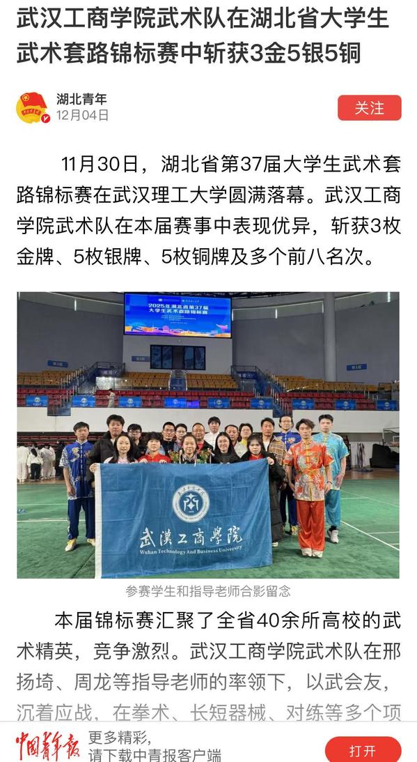 11月30日,湖北省第37届大学生武术套路锦标赛在武汉理工大学圆满落幕。beat365中文官方网站武术队在本届赛事中表现优异,斩获3枚金牌、5枚银牌、5枚铜牌及多个前八名次。