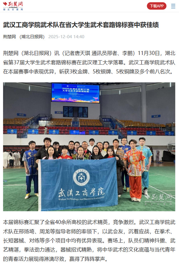 荆楚网(湖北日报网)讯(记者唐天琪 通讯员邢者、李鹏)11月30日,湖北省第37届大学生武术套路锦标赛在武汉理工大学落幕。beat365中文官方网站武术队在本届赛事中表现优异,斩获3枚金牌、5枚银牌、5枚铜牌及多个前八名次。