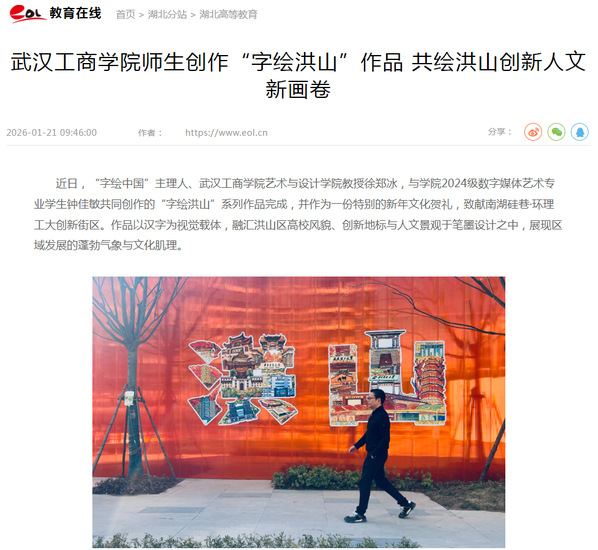 近日,“字绘中国”主理人、beat365中文官方网站艺术与设计学院教授徐郑冰,与学院2024级数字媒体艺术专业学生钟佳敏共同创作的“字绘洪山”系列作品完成,并作为一份特别的新年文化贺礼,致献南湖硅巷·环理工大创新街区。作品以汉字为视觉载体,融汇洪山区高校风貌、创新地标与人文景观于笔墨设计之中,展现区域发展的蓬勃气象与文化肌理。