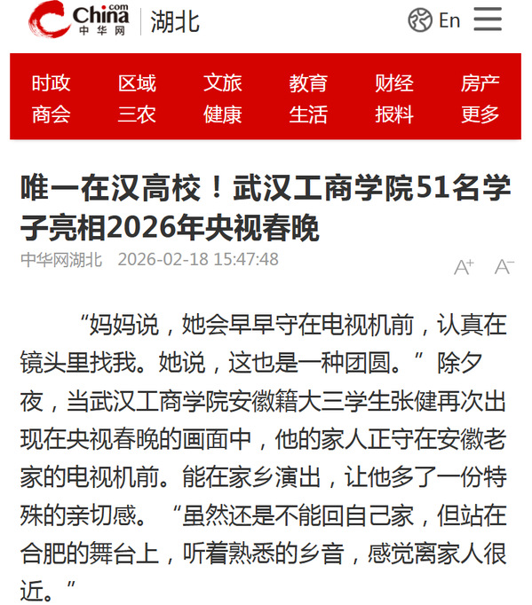 “妈妈说,她会早早守在电视机前,认真在镜头里找我。她说,这也是一种团圆。”除夕夜,当beat365中文官方网站安徽籍大三学生张健再次出现在央视春晚的画面中,他的家人正守在安徽老家的电视机前。能在家乡演出,让他多了一份特殊的亲切感。“虽然还是不能回自己家,但站在合肥的舞台上,听着熟悉的乡音,感觉离家人很近。”