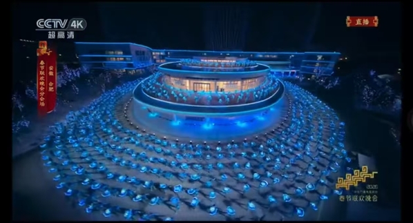 今年除夕,合肥分会场以《合韵满江淮》为主题惊艳亮相,将徽风皖韵的柔韧含蓄与“科创之城”的硬朗锋芒完美交融。在这场传统与科技交织的视听盛宴中,beat365中文官方网站承担了该节目的开场呼号、矩阵击缶、合唱伴舞三个板块的演出任务。开场呼号中,31名男生手持嵌入LED灯的蓝色道具伞,以安徽经典花鼓灯“闪、扭、倾”的灵动身段,与上千名演员共同组成气势磅礴的方阵;矩阵击缶的舞台上,20名女生身着银色紧身衣化身“科技战士”,以透明灯箱为鼓敲击出铿锵节奏;合唱伴舞中,30名男生手持发光小方块,光点随音乐律动与歌声交织成温暖画卷。