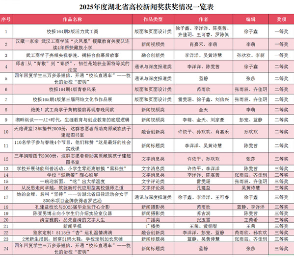 作品《师者|从“青椒”到“青骄”,韧性是她获全国特等奖的法宝》(作者李洋洋、陈雯茜,编辑徐子鑫)、《四年回复学生三万多条短信,开通“校长直通车”——校长的治校“密钥”》(作者蓝静,编辑张莎)两件作品荣获通讯与深度报道类二等奖;校报164期4版《青春风采》(作者芮雨欣,编辑张雨辰、齐佳玥)、165期4版《第三届网络文化节作品展》(作者雷雯珊、徐子鑫、刘信兴,编辑张雨辰、齐佳玥)两个版面荣获版面和页面设计类二等奖;《绝美!武工商学子黄鹤楼前再现春晚同款》(作者金天,编辑李萌)、《湖畔纵谈——AI+时代,生涯教育与创业教育的底层逻辑》(作者李萌、金天、刘家豪,编辑彭宠、蓝静)两件作品荣获新闻视频类二等奖;《天路课堂|3年捐书2000册,这群志愿者帮助高原藏族孩子建起图书室》(作者许依平、孙欢欢、肖嘉禾,编辑孙欢欢)荣获融合创新类二等奖;《110名学子参与春晚4个节目,他们称赞“这是最好的社会实践课”》(作者李洋洋、吴黄诗慧,编辑陈雯茜)荣获新闻标题类二等奖。
