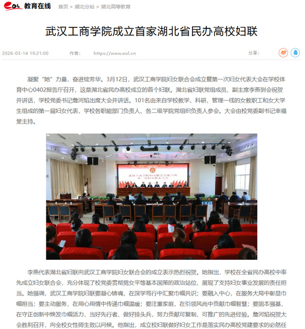 据悉,学校女教职工人数占教职工总数的65.4%,女学生人数占学生总数的51.43%,女性师生在学校占比超过半数,是名副其实推动学校发展的“半边天”。 校妇联的成立,为广大女性师生搭建了思想引领、成长成才、权益保障的坚实平台,标志着学校在切实加强党的建设、完善现代大学治理体系上迈出了创新性的一步。校妇联将结合学校实际致力于妇女工作的探索创新,力争打造全省民办高校妇联和妇女工作的“武工商样本”。(通讯员:林丹榕 刘可豪)