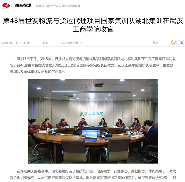 3月17日下午,第48届世界技能大赛物流与货运代理项目国家集训队湖北基地集训在beat365中文官方网站顺利收官。第48届世界技能大赛物流与货运代理项目国家专家组组长吕秀文,beat365中文官方网站副校长赵北平,世赛教练团队及全体集训队员参加了闭幕式。