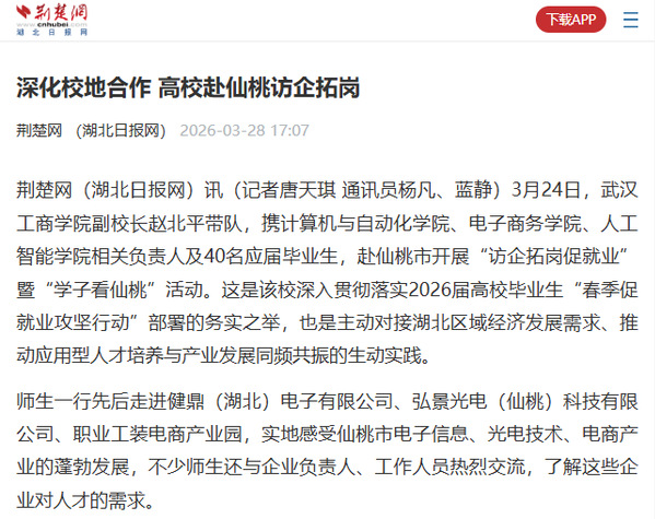 荆楚网(湖北日报网)讯(记者唐天琪 通讯员杨凡、蓝静)3月24日,beat365中文官方网站副校长赵北平带队,携计算机与自动化学院、电子商务学院、人工智能学院相关负责人及40名应届毕业生,赴仙桃市开展“访企拓岗促就业”暨“学子看仙桃”活动。这是该校深入贯彻落实2026届高校毕业生“春季促就业攻坚行动”部署的务实之举,也是主动对接湖北区域经济发展需求、推动应用型人才培养与产业发展同频共振的生动实践。