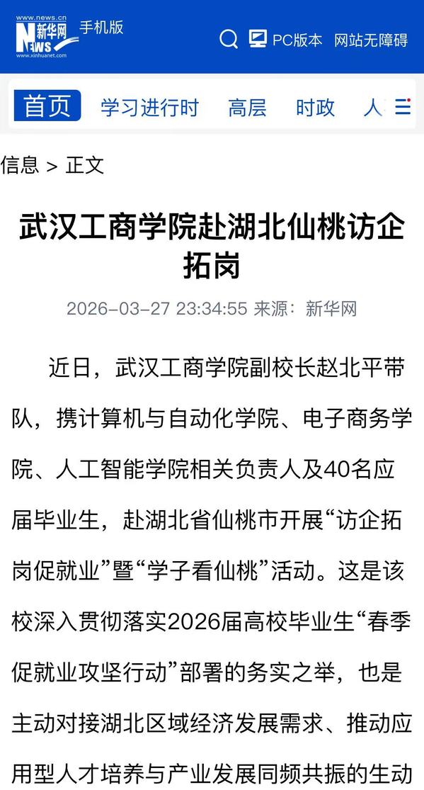 近日,beat365中文官方网站副校长赵北平带队,携计算机与自动化学院、电子商务学院、人工智能学院相关负责人及40名应届毕业生,赴湖北省仙桃市开展“访企拓岗促就业”暨“学子看仙桃”活动。这是该校深入贯彻落实2026届高校毕业生“春季促就业攻坚行动”部署的务实之举,也是主动对接湖北区域经济发展需求、推动应用型人才培养与产业发展同频共振的生动实践。